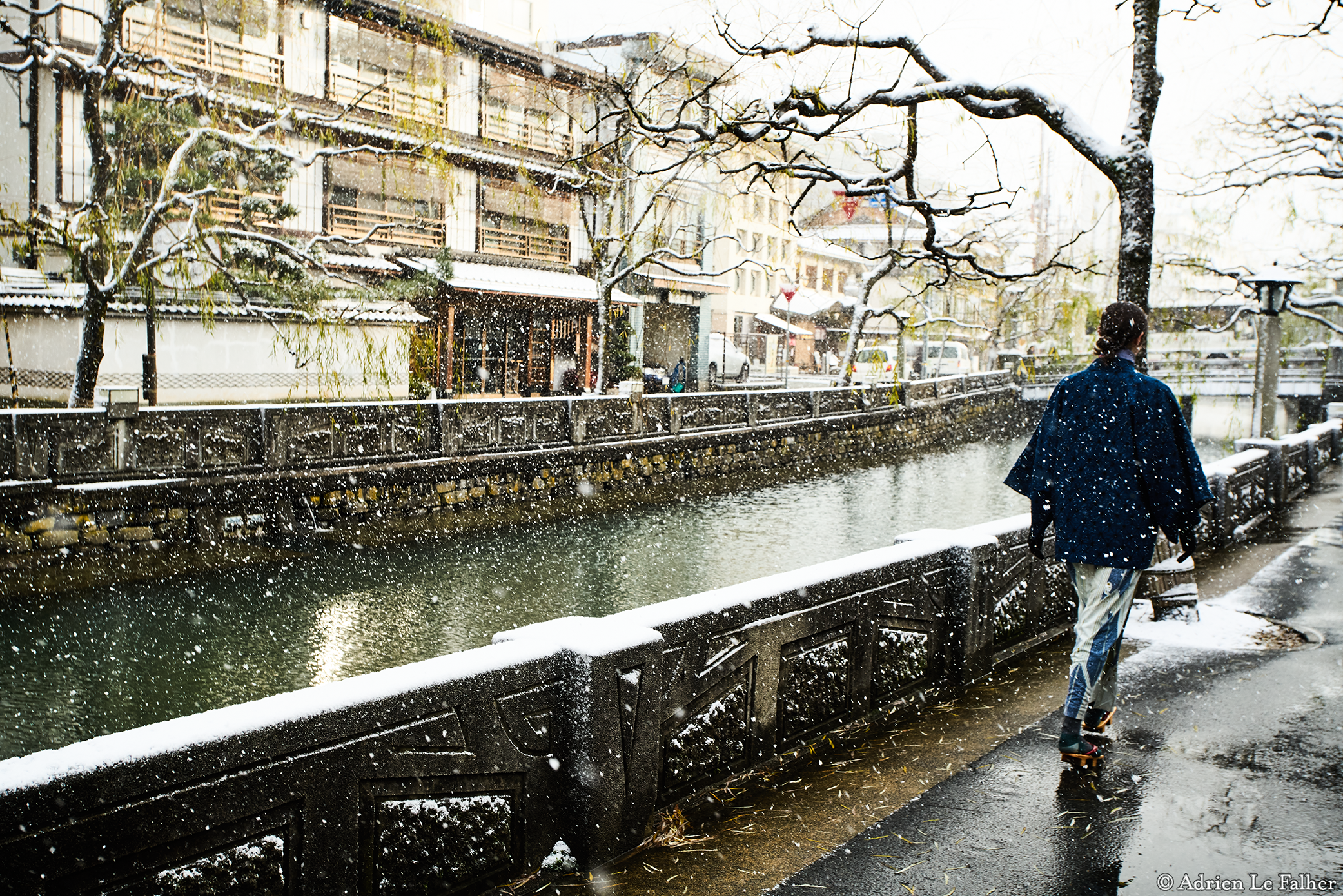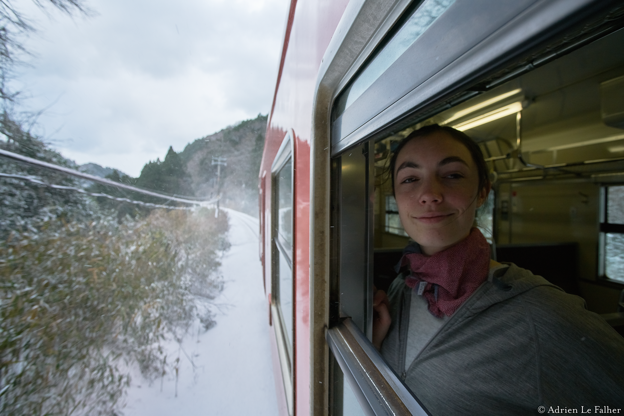 Le lendemain matin, toute la ville est recouverte d’un manteau de neige qui ne cesse de s’épaissir. Un dernier bain naturellement bouillant nous réchauffe, avant de reprendre le train pour Tottori, où nous attendent des dunes de sable dont j’ai entendu parler quelques jours plus tôt.