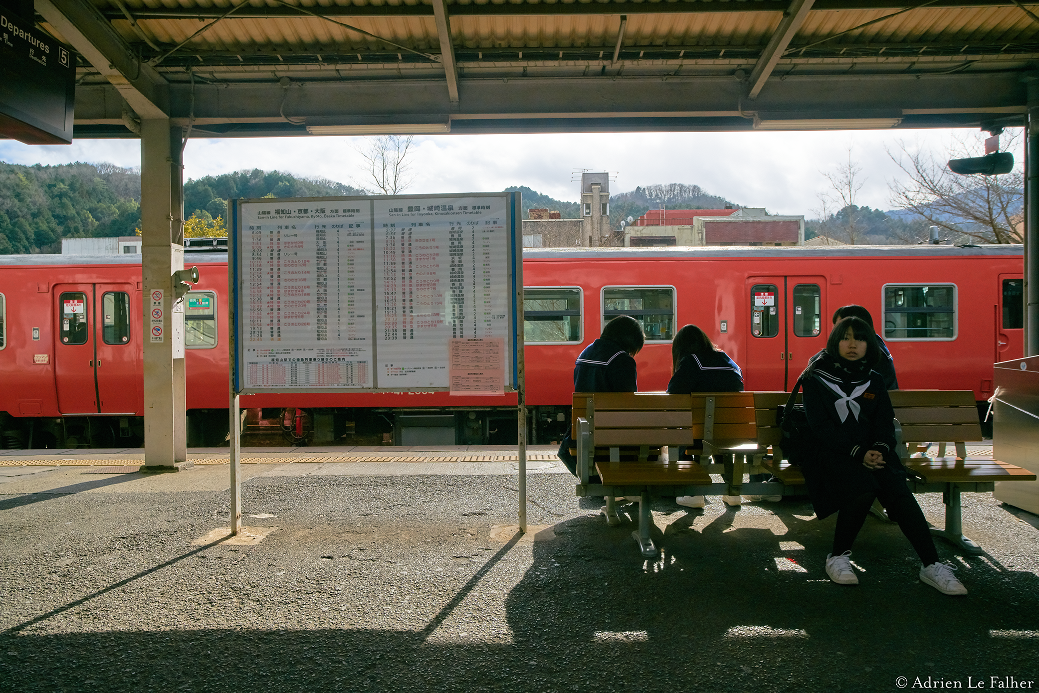 Le chemin, dans ce train minuscule, nous a conduit à travers la campagne japonaise, celle qu’on ne voit que rarement, parce que sans charme à qui ne serait le voir. Et pourtant… Dans ce défilement de petits villages, de rizières comme autant de jardins derrières ces maisons japonaises, une harmonie fugace ce forme. Tout se mélange, et on se laisse pénétrer par le charme tranquille de ces bourgades, à la fois exotiques et familières. Le train se vide, nous restons seuls dans le wagon.