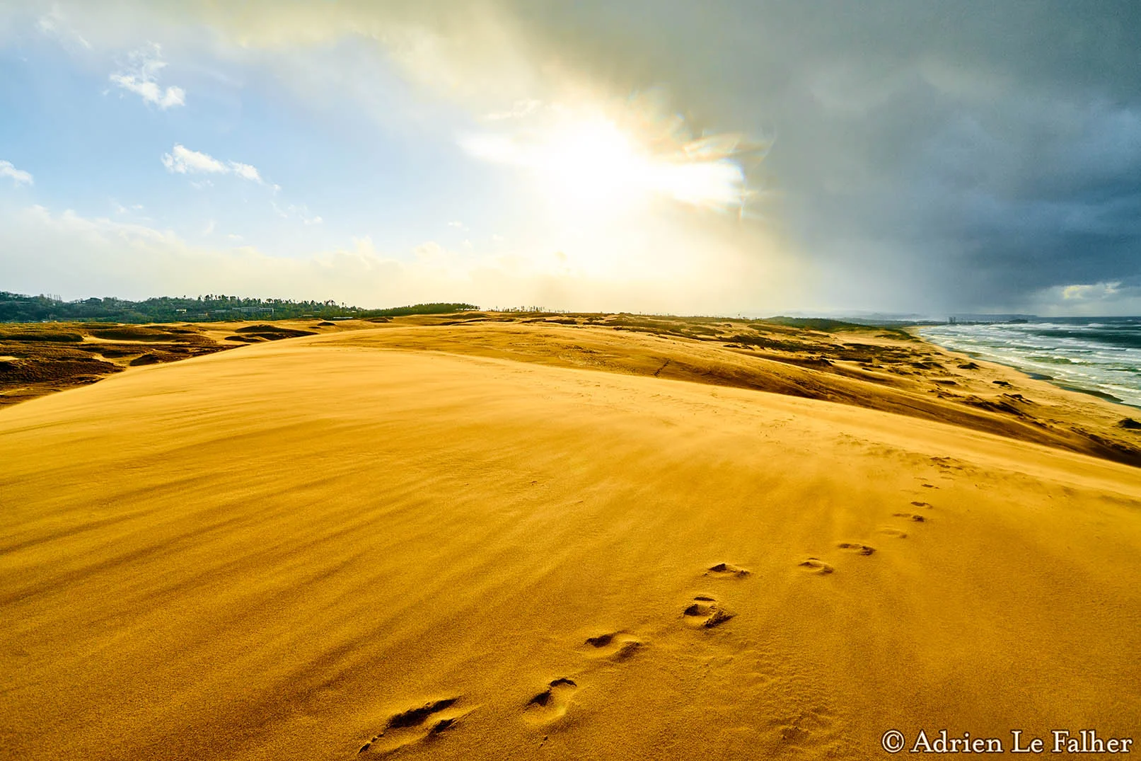 La montagne d’un côté, la mer de l’autre, et entre les deux, ces dunes, sculptées par le vent violent. Au-dessus de nous, un ciel menaçant, et par moment, le soleil, qui perçait les nuages.