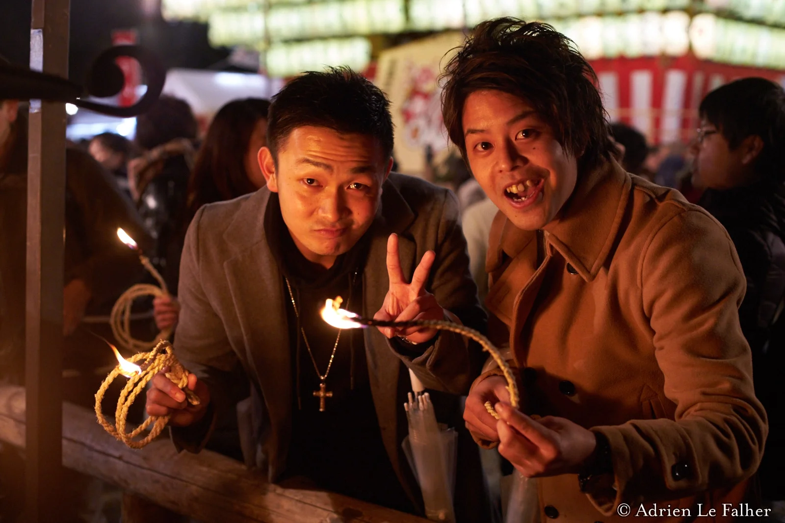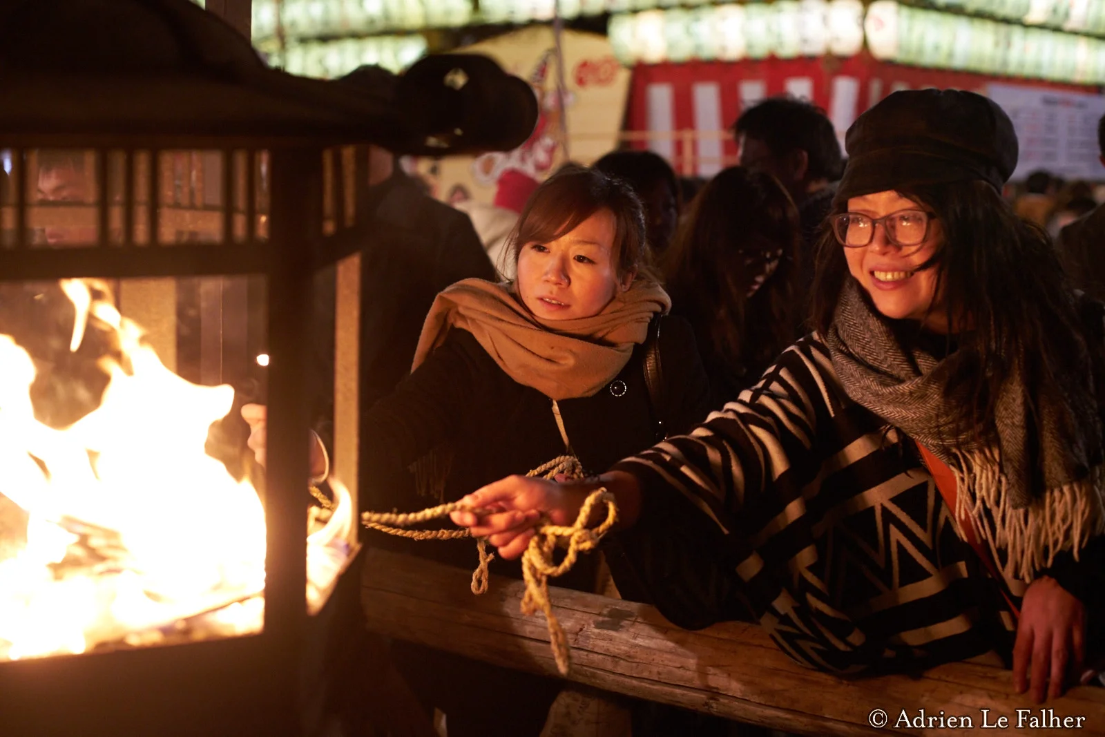 Les japonais utilisent une corde de bambou pour recueillir la flamme. C’est cette corde, qu’ils gardent embrasés en la faisant constamment tournoyer, qu’ils ramènent ensuite chez eux pour préparer le premier feu de l’année, celui qui sert à cuisiner le zoni, cette soupe au mochi traditionnelle du nouvel an.